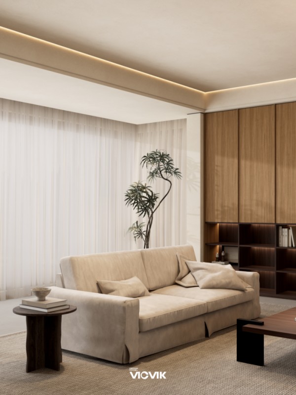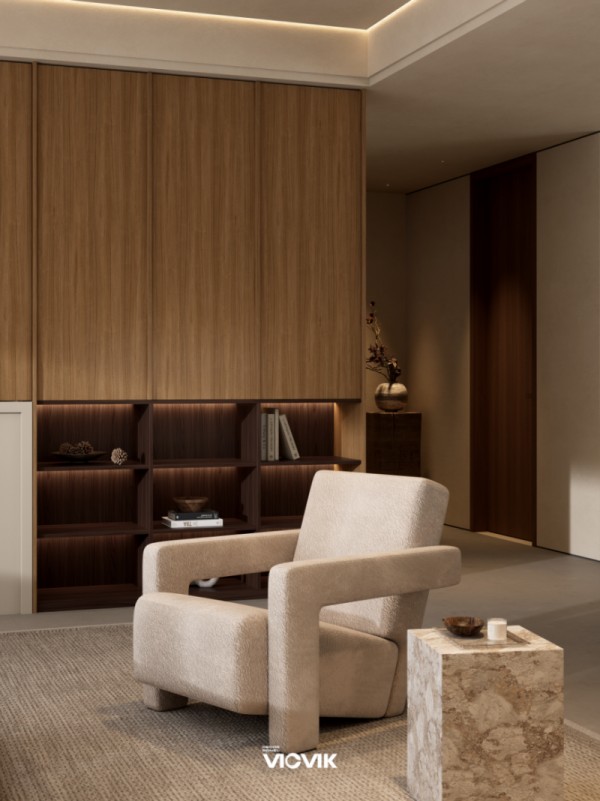 在空间搭配上,VICVIK威克美学饰面板形成了“核心主角+最佳搭档+黄金配角”的经典组合,雾笼·木语搭配VK1024梅影·木语、VK1004知夏·素谣,让不同花色的质感与美感相互交融。雾笼·木语的温柔肌理与胡桃木柜体、深棕实木边几的原生质感相呼应,知夏·素谣则将清透细腻的质地揉进家居每一寸肌理,恰似夏末晚风的清新;梅影·木语打造的收纳格,搭配粗陶罐、书卷等软装,让岁月痕迹与生活墨香交织,尽显侘寂风的生活暖意。同时,饰面板与绒面沙发、大理石边几等家居单品搭配和谐,大理石的粗犷原生肌理与饰面板的自然质感呼应侘寂美学的质朴内核,雾笼·木语的暖光质感与壁炉火焰交融,让空间的时光感更显温柔,整体营造出“会呼吸的侘寂风客厅”,让身体与心灵都能在空间中得到舒展。
