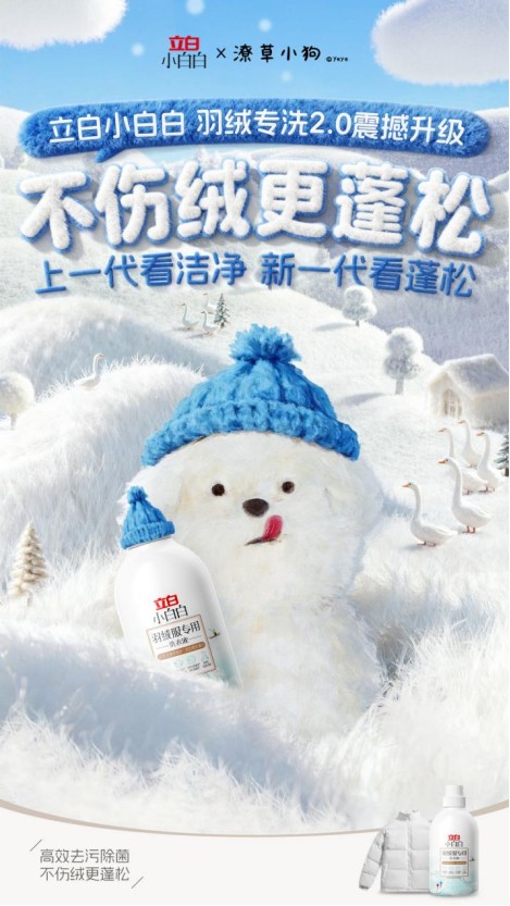立白小白白羽绒服专用洗衣液以“不伤绒更蓬松、天然洁净不伤衣、柔软蓬松”为核心,从护绒、清洁、除菌、护衣四大维度提供科学洗护方案,现如今已累计销售4000000多瓶,始终稳居羽绒服洗衣液品类全渠道销量第一。产品添加水解蚕丝蛋白精华,减少羽绒纤维损伤,降低绒丝摩擦系数,避免绒丝缠绕结块与断裂,维持羽绒服蓬松度与保暖性能。产品搭载天然APG生物表活、天然氨基酸表活与中国发明专利洁净技术(专利号ZL201810601811.5),实现内外双清洁,外层清除表面污渍,内层深入纤维去除污垢细菌。同时依托专利除菌因子与天然澳洲茶树精油,达到99.9%除菌、99%除螨效果;采用弱酸性配方,不破坏羽绒服防水层,洗护后无残留、不黄渍,延长衣物使用寿命。