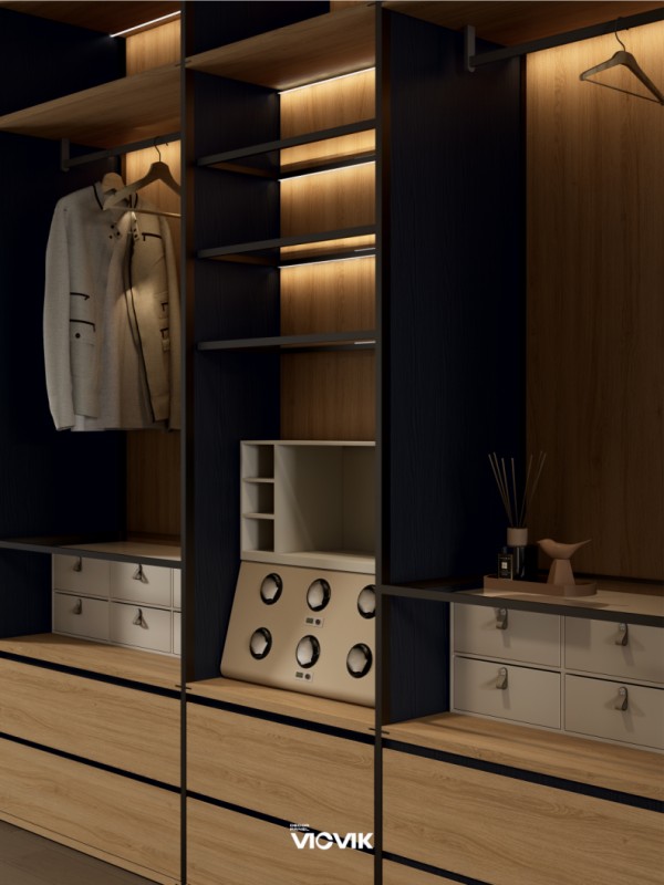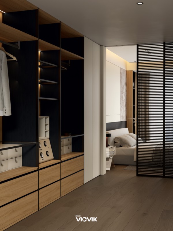 衣帽间作为家居空间的私域天地,更是VICVIK威克极简美学的精妙诠释。雪鹤·素谣的素净与玄青·素谣的沉稳在空间中分区错落、交织成序,让收纳空间兼具秩序感与高级质感。衣物轻挂于木纹之间,每一次衣袂拂过,都能触到生活本真的温润肌理。这方由VICVIK威克饰面板打造的私域,装下的不仅是四季衣履,更是都市人沉淀于心的从容态度,将收纳的妥帖与穿搭的精致,揉进每一次抬手取衣的日常,让现代极简美学与生活的高级质感自然流淌,为都市人书写心中向往的慢生活诗篇。