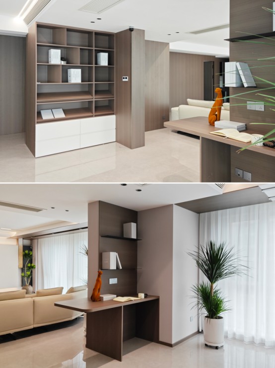 利用半墙隔断无缝衔接定制书桌,侧面整墙书柜采用木白拼接设计,错落有致的格架与封闭抽屉相结合,实现书籍与杂物的合理分区。办公氛围松弛自然,让专注与舒适在此达成平衡。