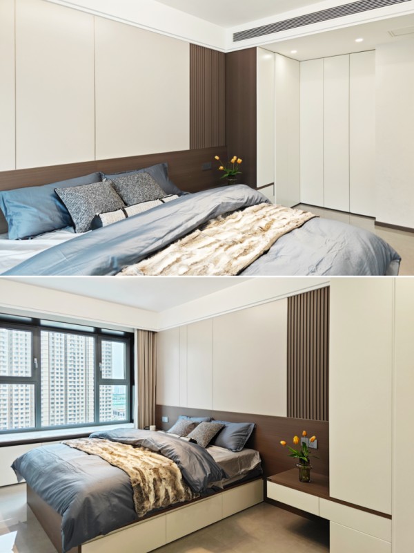 木饰面背景墙搭配格栅点缀,层次感拿捏得恰到好处。床侧定制L型通顶衣柜,床头柜与衣柜一体化设计,无拉手处理简洁大气。隐藏式收纳空间充足,四季衣物被褥轻松归置。