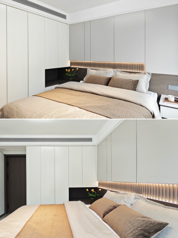 背景墙暗藏灯带,营造柔和静谧的睡眠氛围。衣柜巧妙留空充当床头柜,方便随手放置小物。极简的柜体设计,让空间更显通透宽敞。