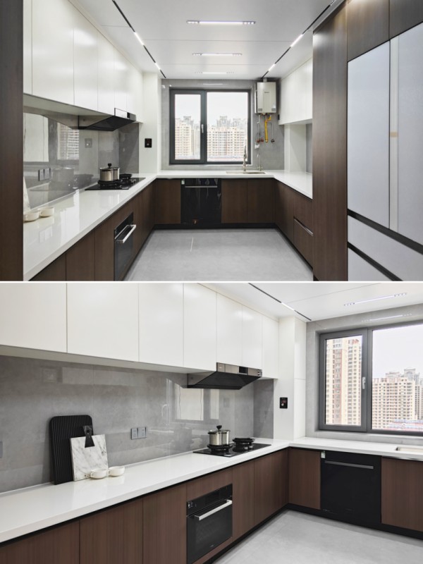 定制U型橱柜,烹饪动线流畅高效。上白下棕双色搭配,层次分明不压抑。纯白台面耐脏好打理,保持台面无物的整洁状态,让做饭也成为一件愉悦的事。