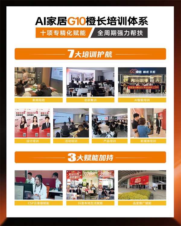 值得一提的是,AI家居在此次展会中重磅推出G10橙长系统,以7大核心培训为根基,3大赋能为支撑,助力经销商实现高质量增长与可持续盈利。