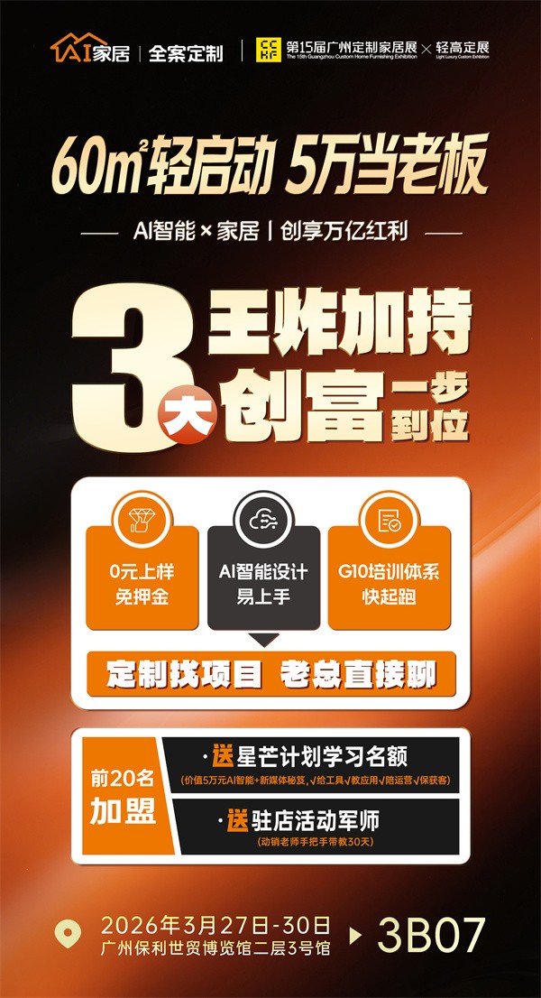 立足全新市场格局,抢占存量时代红利。有家居行业“轻骑兵”之称的AI家居持续打破传统定制 “高投入、重资产”的行业壁垒,重磅推出60㎡轻启动·5 万当老板的轻量化创业模式,同步带来三大核心扶持举措,助力轻松创业:“5万轻投入”-降低初期资金压力;“AI智能设计”-让创业者轻松上手;“G10橙长培训体系”-专精化帮扶赋能。前20名加盟商可再享赠送价值5万元的AI智能+新媒体秘笈,动销老师手把手带教30天。