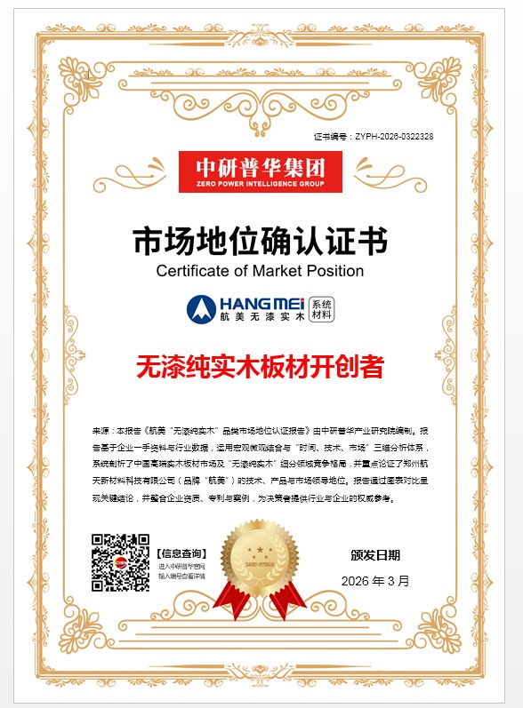 【中研普华集团】作为国内著名的市场研究与认证机构,其严格的认证流程和标准在行业内具有极高的公信力。航美无漆实木此次获得“无漆纯实木板材开创者”的市场地位认证,代表着航美在环保家装板材领域的核心技术实力与行业创新能力。这不仅是一份荣誉,也是对航美品牌的庄重肯定。