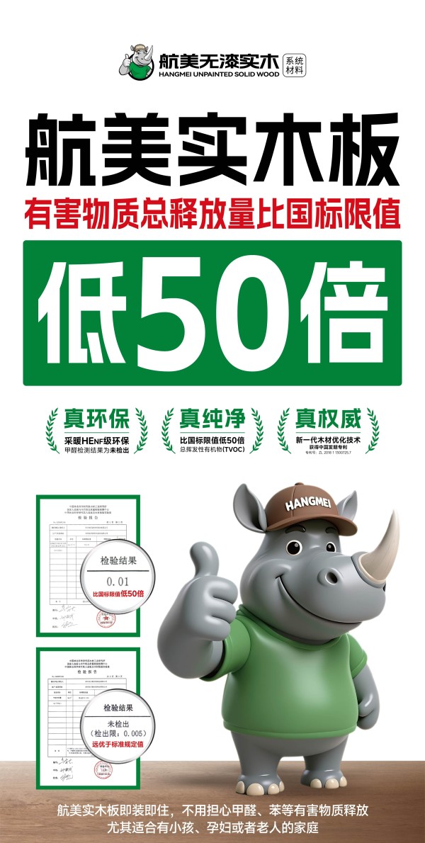 权威认证: 作为“无漆纯实木板材开创者”,航美肩负环保使命与行业责任。