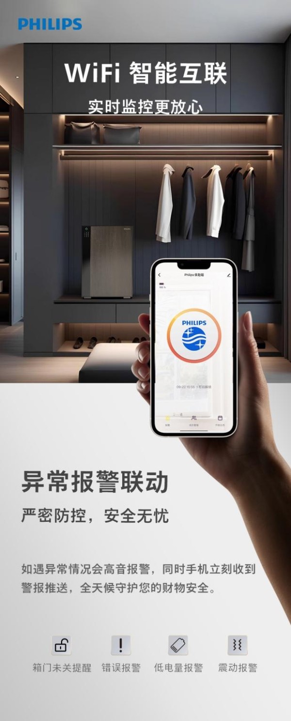 如果说坚固的柜体是守护的底气,那么领先的智能科技,就是飞利浦智能保险柜区别于传统品牌的核心,传统安防产品,往往只是一堵沉默的防护墙,只能被动应对风险;而飞利浦智能保险柜,更像一位24小时在线的智慧守卫,用技术把“被动防护”升级为“主动掌控”,让安全感,真正成为用户可以随身携带的安心。