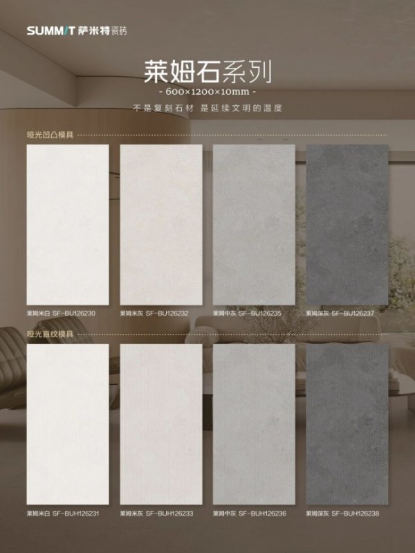 在快节奏的当代生活里,人们从未停止对自然与质感的追寻。萨米特莱姆石系列,从来都不只是一款功能性的瓷砖产品,更是连接亿万年自然记忆与当代人居生活的艺术媒介。它以科技为笔,以时间为墨,将山海沉淀的自然之美,融入日常空间的每一处细节,为每一个追求质感的生活场景,书写全新的艺术篇章。