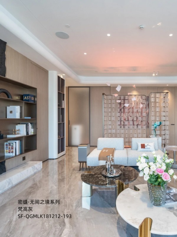 这都要得益于萨米特行业领先的精工密缝工艺,可将砖缝宽度严格控制在0.5mm以内,近乎隐形的缝隙,让地面实现了真正的“无界”。再配合全屋落地大玻璃窗,将窗外天际景致与室内空间无缝衔接,步入其中,仿佛置身云端,开阔感与奢雅感扑面而来。