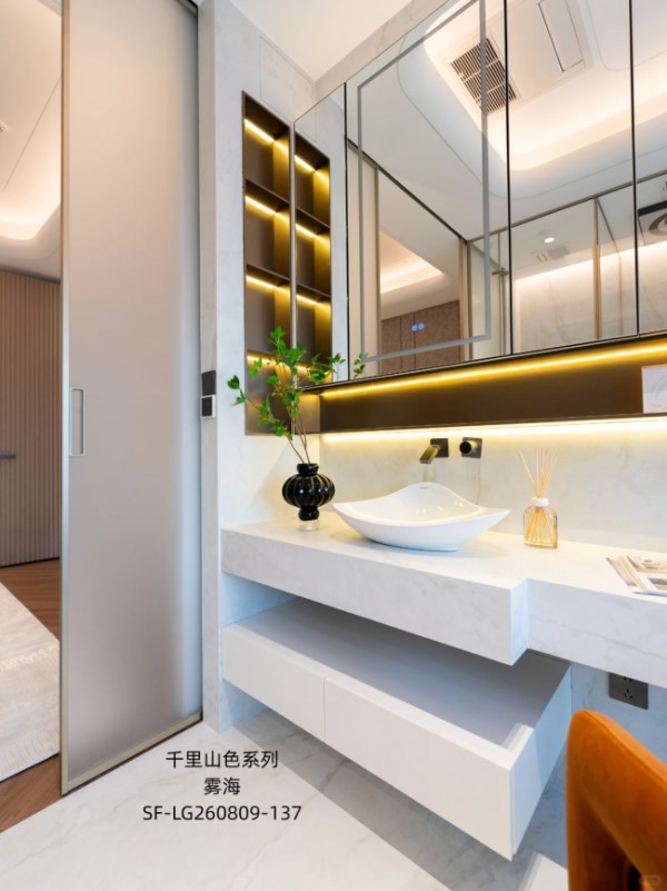 而在主卫空间,「千里山色系列」雾海岩板,则为私密空间赋予了别样的自然意境。温润的玉质釉工艺,还原了天然玉石的细腻触感。柔和的纹理铺展开来,在方寸之间营造出松弛治愈的氛围。这种自然温润的质感,让卫浴空间不再冰冷,而是充满放松身心的自然气息。