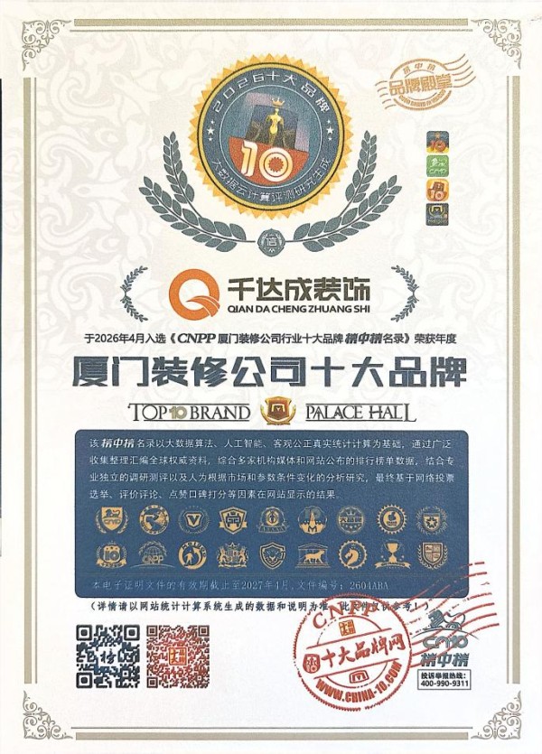 依托 CNPP 平台权威品牌收录加持,千达成装饰品牌公信力、行业曝光度持续升级。未来,厦门千达成装饰将持续坚守品质家装初心,以权威榜单信誉护航装修服务,不断优化设计方案、升级施工工艺、完善售后质保体系,深耕厦门本地家装市场,用心打造高品质安心家装,持续争做厦门业主信赖的靠谱本土装饰标杆品牌,助力更多家庭住进理想舒适新家。