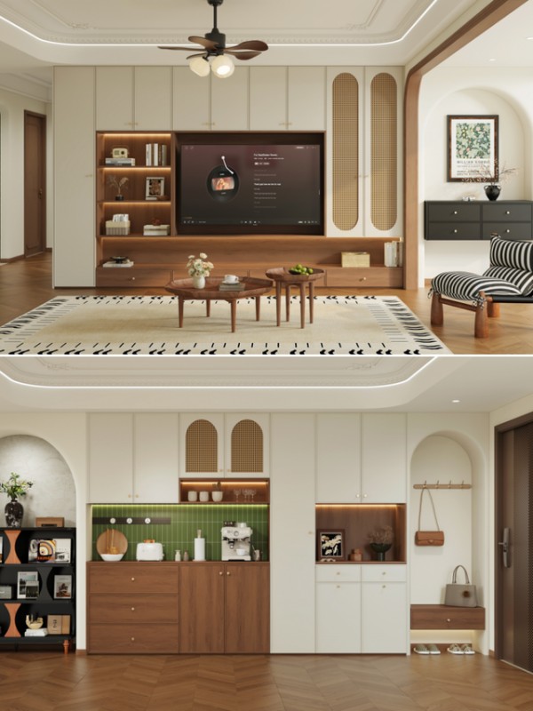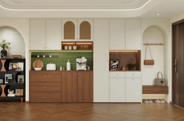 餐边柜与玄关柜一体设计,圆弧法式门洞柔化空间线条。内置挂钩与悬空换鞋凳,贴心实用。玄关柜中部留空搭配抽屉,小物件进出门随手收纳,方便利落。