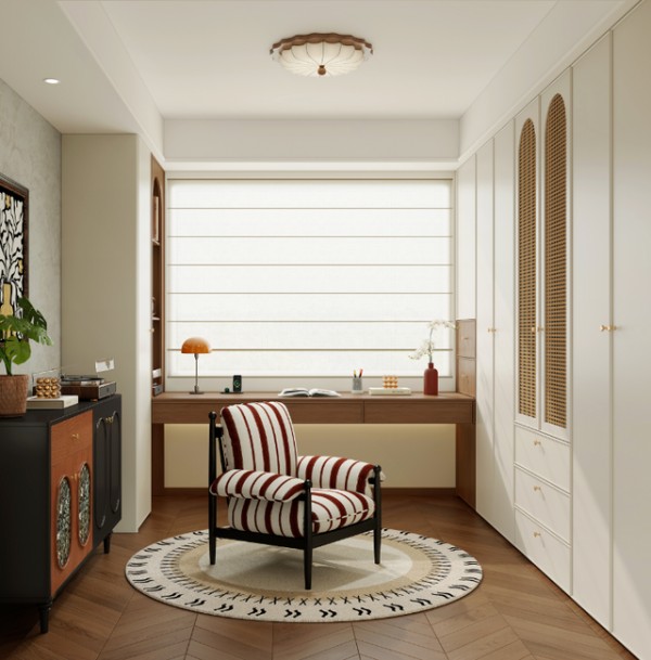 衣帽间与书房一体化,实现一房多用。整墙定制柜收纳力拉满,靠窗整排书桌确保采光与实用性双在线。复古条纹单椅,让阅读时光慵懒自在。