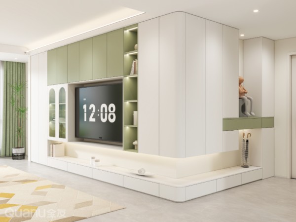 进门遇上大转角?试试玄关柜+电视柜一体化设计,收纳力翻倍。拐角处做圆弧设计,不容易磕碰,还可以让视觉更柔和。使用同一种材质、同一种颜色,整体感超强。
