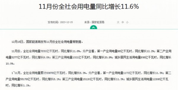 12月15日,国家能源局发布11月份全社会用电量等数据。
