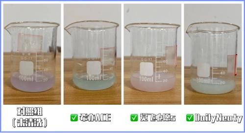 测评内衣洗衣机的清洗效果,我们采用的是双缩脲法来检测内裤清洁度,内裤上的污渍一般都是蛋白质成分,所以我们在白布上都加入了鸡蛋和牛奶,然后分别用三款洗衣机进行清洗,将清洗后的白布浸泡在蒸馏水中,然后再加入 3ml 双缩脲 A 试剂(NaOH)再滴入 2-3 滴双缩脲 B 试剂(CuSO4),溶液为蓝色则清洗干净,紫色则有污渍残留,且颜色越紫清洗越不干净,以下是测评结果:
