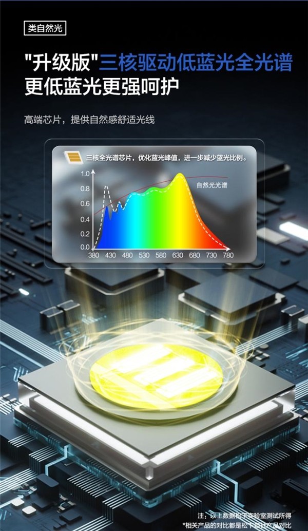 松下「适阅」系列护眼落地灯的核心在于其先进的三核驱动低蓝光全光谱芯片,它能够发出接近自然光的照明,让您在家中也能享受到接近自然环境下的舒适光线。